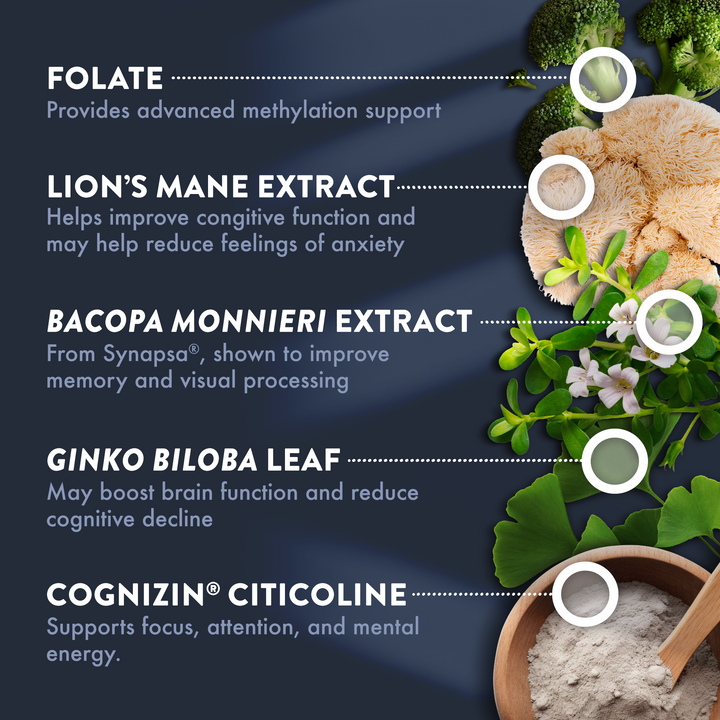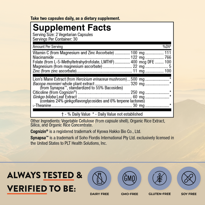 With Cognizin® Citicoline, Synapsa® Bacopa, and Lion’s Mane Mushroom