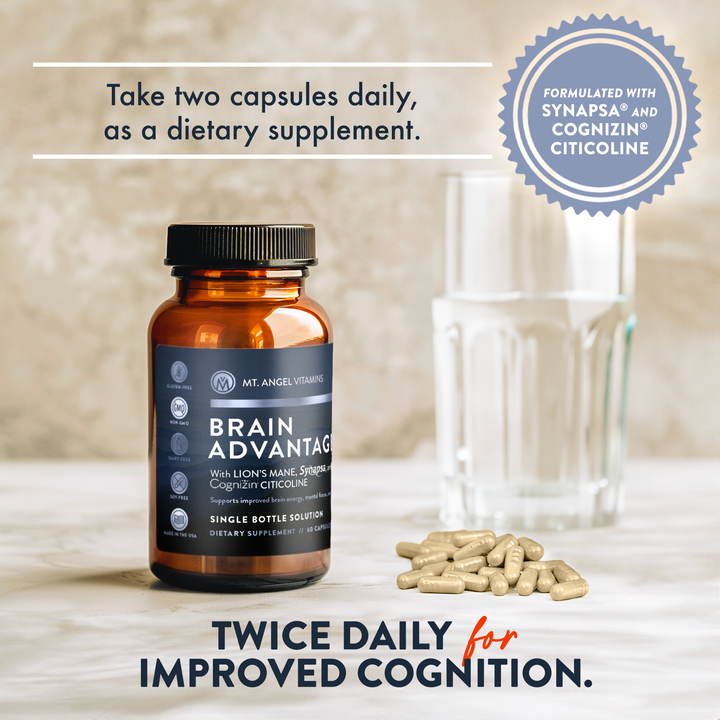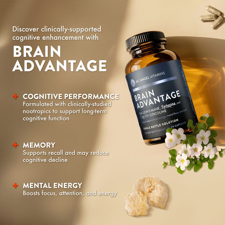 Unlock sharper memory, sustained focus, and long-term cognitive performance with Brain Advantage from Mt. Angel Vitamins. This powerful daily brain supplement is expertly formulated with clinically studied nootropics and neuroprotective nutrients to support mental clarity, reduce stress, and protect against cognitive decline.*