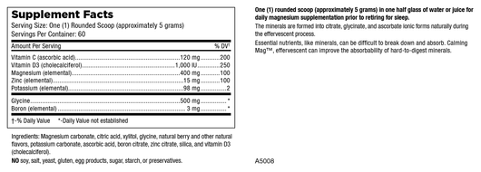 Calming Mag Powder provides 400 mg magnesium plus vitamin C, vitamin D3, zinc, potassium, glycine, and boron in a drinkable powder. Together, these nutrients support normal muscle relaxation, nervous system function, mood balance, and a calm evening routine in healthy adults.*