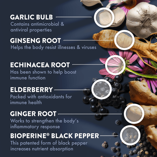 Vitamin D3, astragalus, echinacea, elderberry, garlic, ginseng, ginger, zinc and copper for daily immune support.*