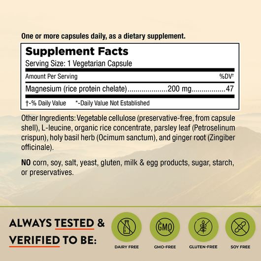 Each capsule provides a gentle, amino acid chelated form of magnesium that is designed for better absorption than many standard magnesium oxide products, in a simple, dairy free, gluten free, soy free, GMO free formula made and tested in Mt. Angel, Oregon.