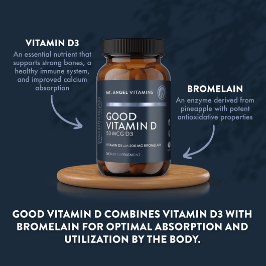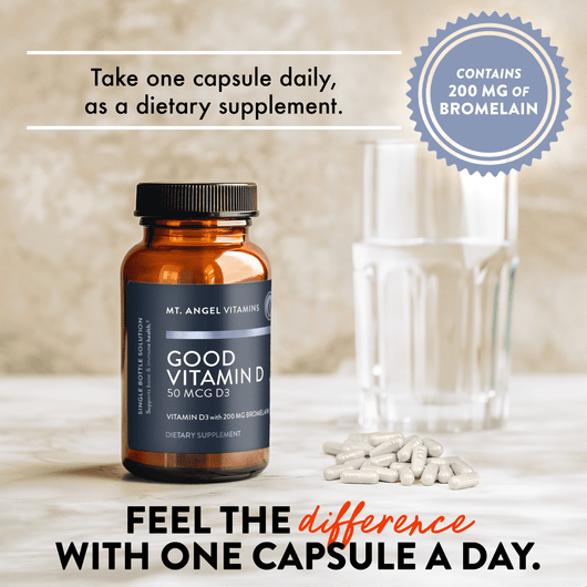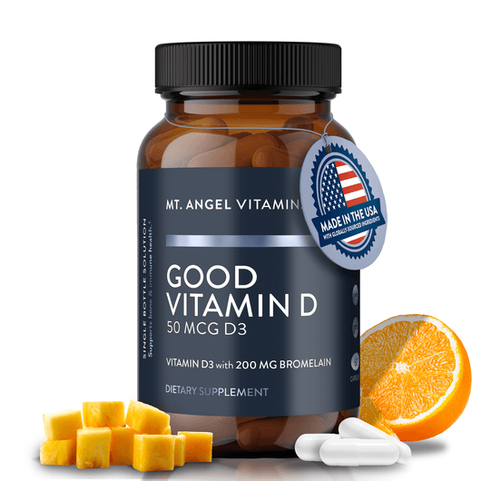 Good Vitamin D is your straightforward capsule‑based D3 foundation. You can plug it into several different Mt. Angel stacks.