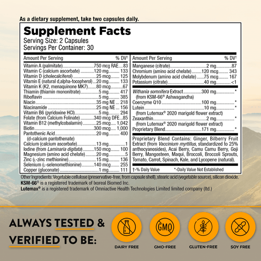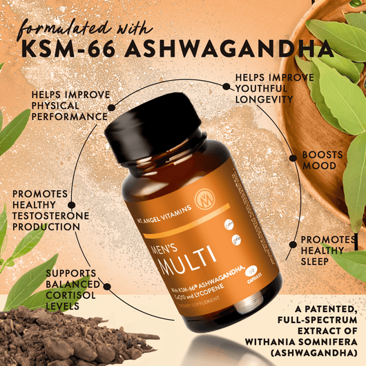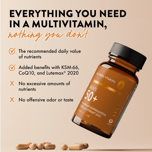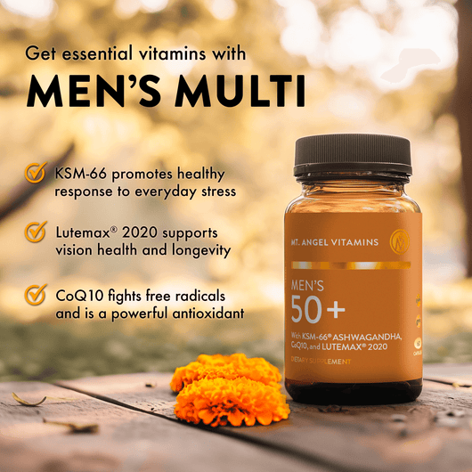 Mt. Angel Vitamins Men's 50+ Multivitamin is a once daily formula designed specifically for men over 50 who want reliable support for heart health, brain function, eye health, energy, and overall longevity. It combines highly bioavailable vitamins A, B, C, D, E and K2 with KSM 66® ashwagandha, CoQ10, Lutemax® 2020, and a concentrated fruit and vegetable blend to support healthy aging from multiple angles.
