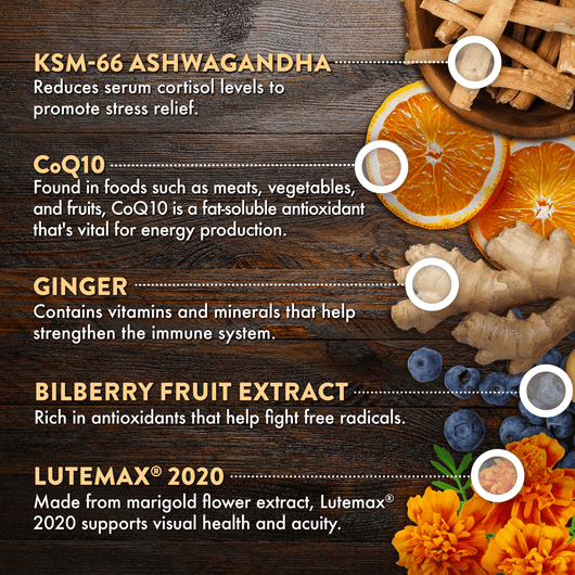 - KSM 66® ashwagandha (300 mg). Full spectrum root extract studied for support of stress, mood, cognitive performance, and physical endurance.