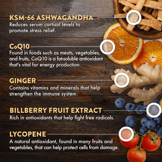 - KSM-66® ashwagandha for stress and resilience support, studied in adults for its impact on stress scores, sleep, and perceived well being.*