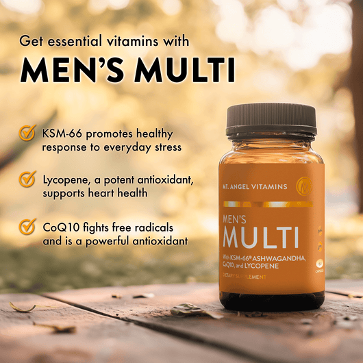 Men’s Multi from Mt. Angel Vitamins is a complete daily multivitamin for men made for real life. It covers the key vitamins and minerals men tend to fall short on, and layers in KSM-66® ashwagandha, CoQ10, lutein, and targeted antioxidants to support steady energy, heart and immune health, stress response, and long term wellness.*